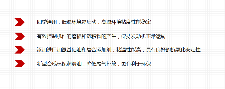 采用進(jìn)口加氫基礎(chǔ)油和進(jìn)口復(fù)合添加劑調(diào)和配制,四季通用,低溫環(huán)境易于啟動,高溫環(huán)境粘度性能穩(wěn)定,有助于控制機件的磨損和沉積物的產(chǎn)生,保護(hù)發(fā)動機正常運轉(zhuǎn);