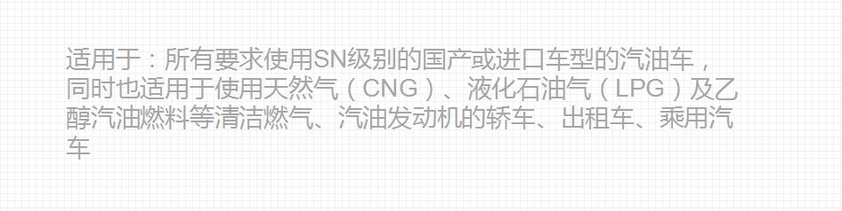 適用于所有要求使用SN級別的國產(chǎn)或進(jìn)口車型的汽油車,同時也適用于使用CNG、LNG及乙醇汽油燃料的出租車、乘用汽車。